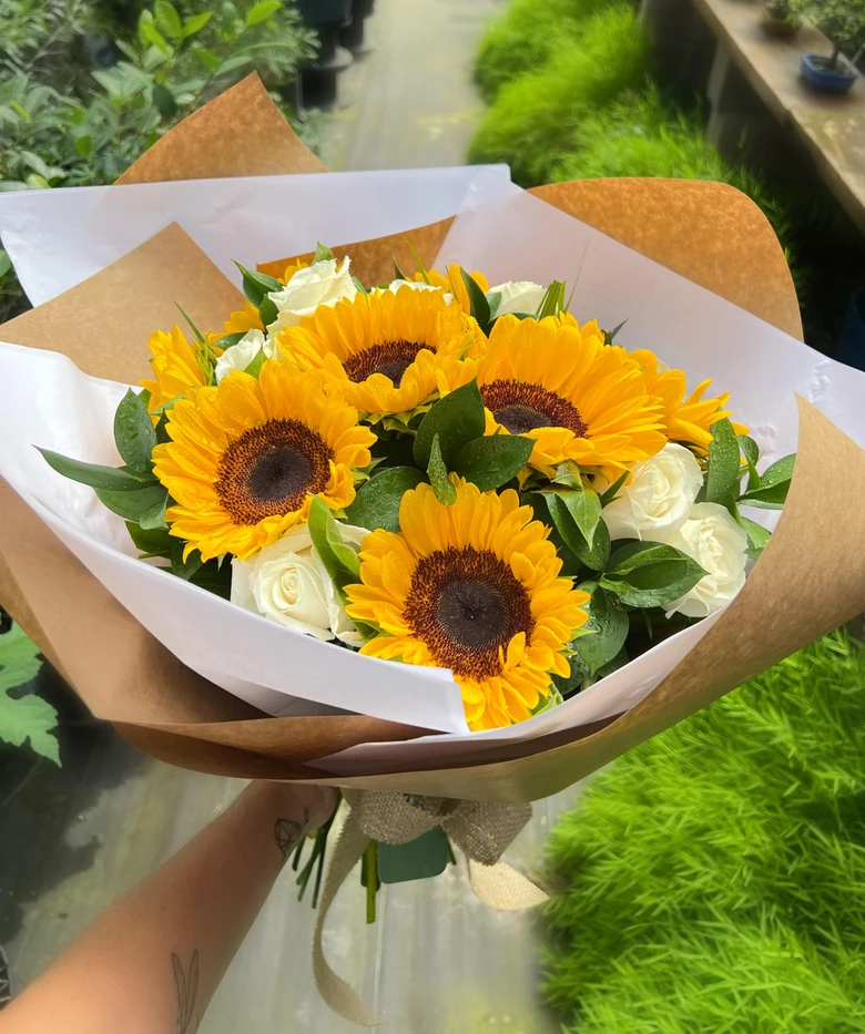 Buque belíssimo composto por 8 rosas brancas nacionais e 8 girassol, evidenciado em embalagem em branco e pardo.